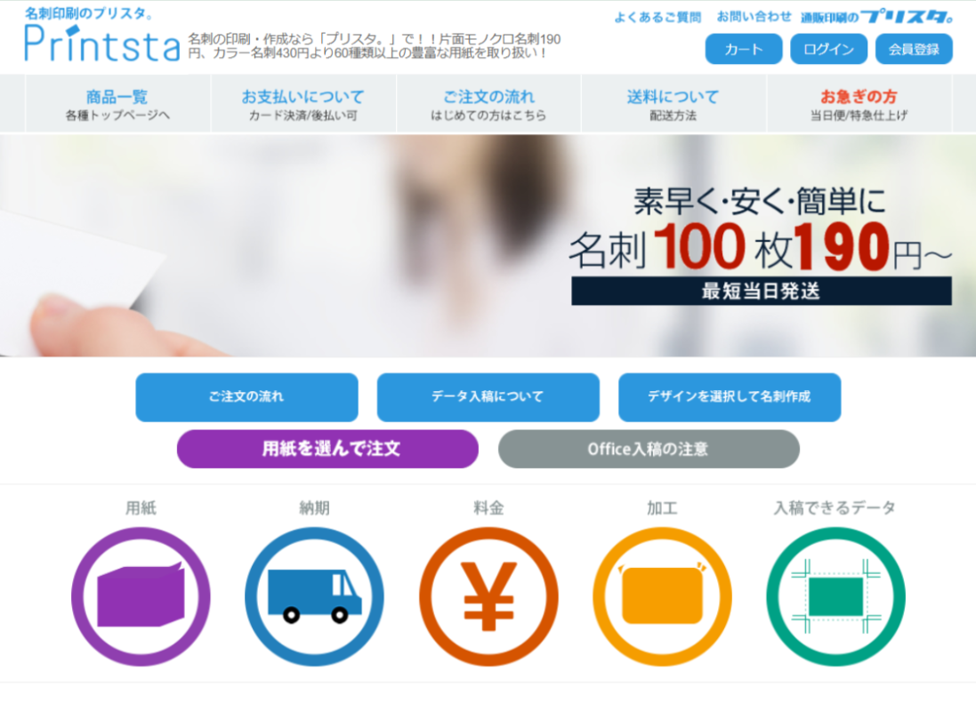 ![]() | 名刺作成サービス「プリスタ」なら、名刺100枚190円~ | ・100枚190円~と安いからお試しで作ってみるのも良い ・紙の種類が60種類くらいあるので選ぶのも楽しい |